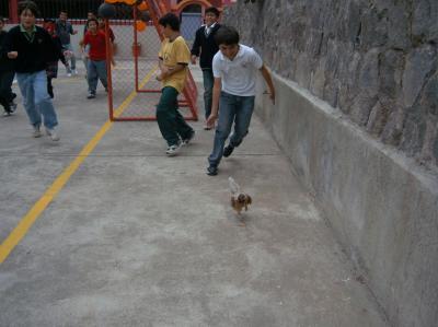 ohh und dann gibt es hier ein grausammes spiel. theoraetisch ist es wie fussball, nur wird es mit einem huhn gespielt. ZIEL=TORE ; BALL=HUHN